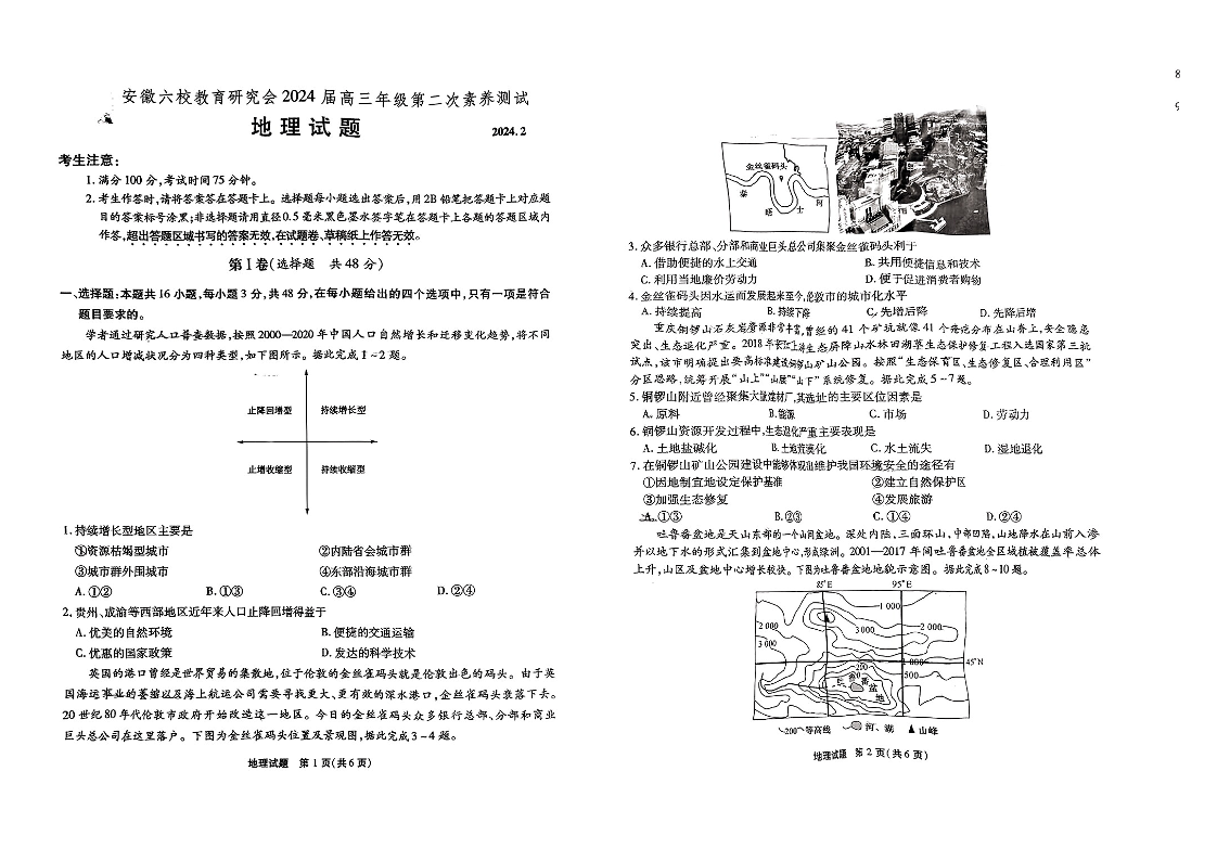 安徽省六校教育研究会2023-2024学年高三下学期下学期第二次素养测试(2月)地理