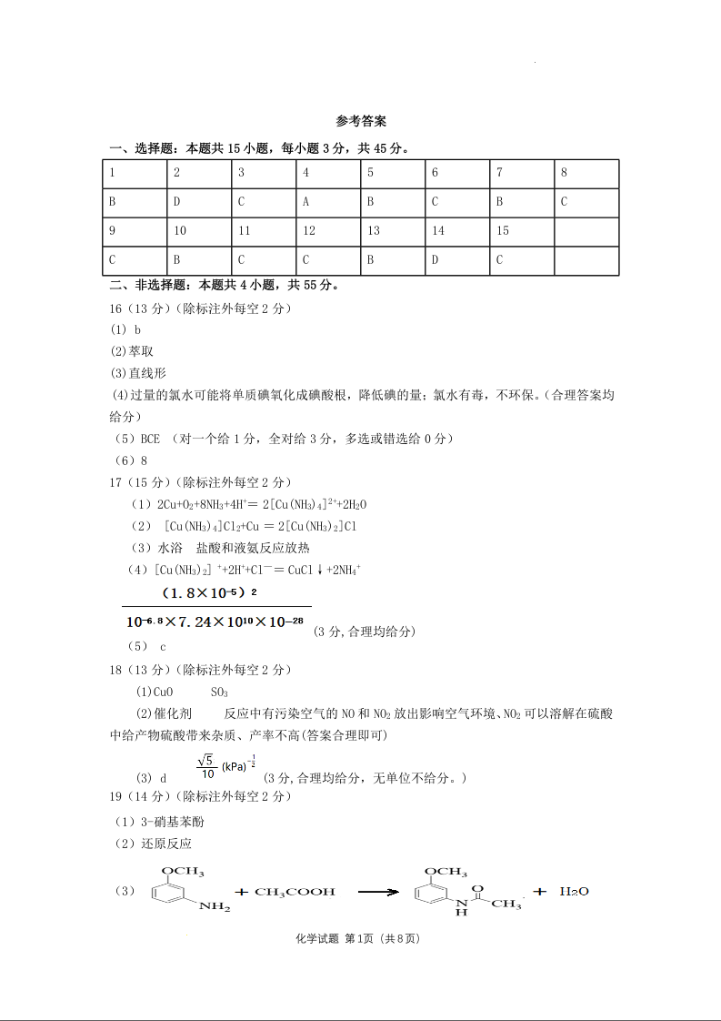 安徽省六校教育研究会2023-2024学年高三下学期下学期第二次素养测试(2月)化学答案