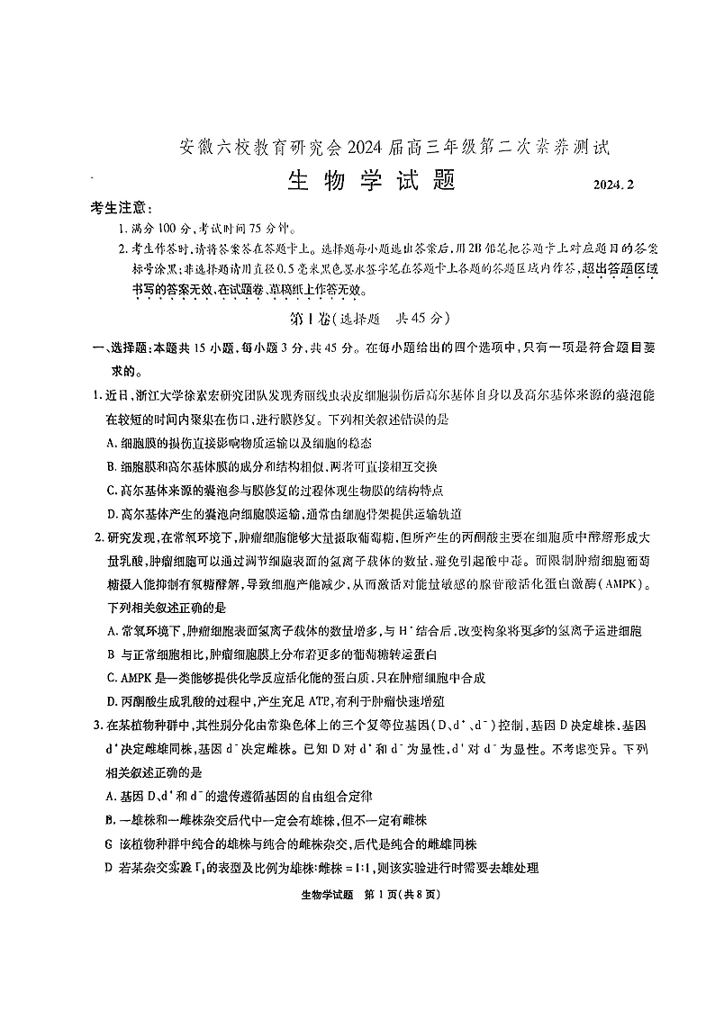 安徽省六校教育研究会2023-2024学年高三下学期下学期第二次素养测试(2月)生物