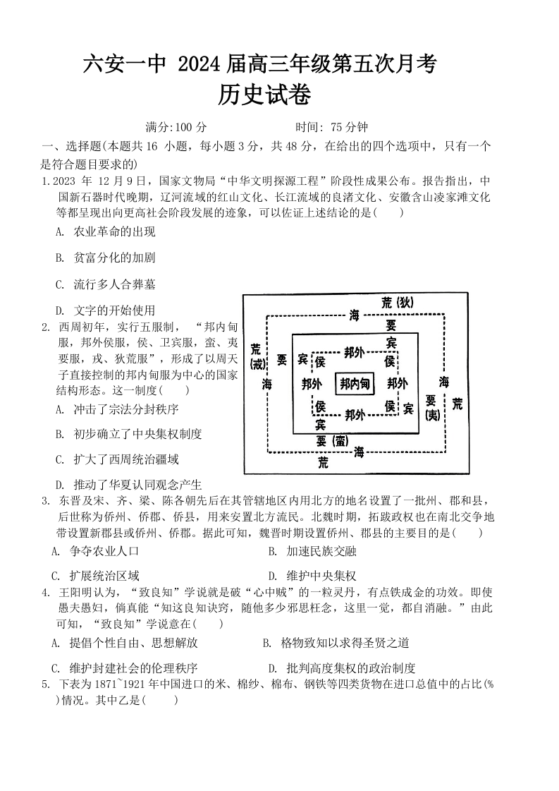 安徽省六安市第一中学2023-2024学年高三上学期第五次月考 历史