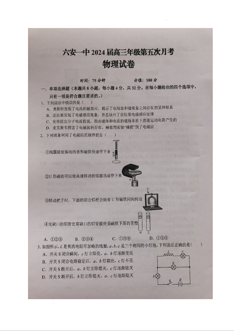安徽省六安市第一中学2023-2024学年高三上学期第五次月考 物理