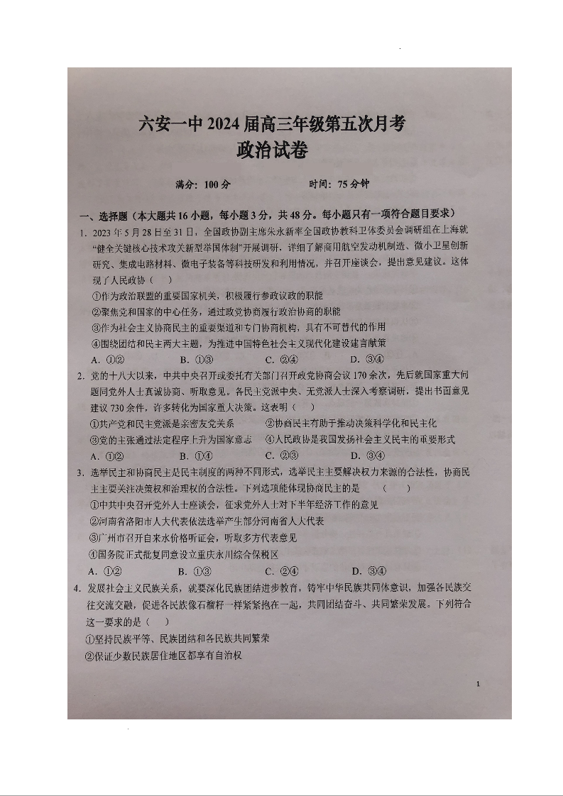 安徽省六安市第一中学2023-2024学年高三上学期第五次月考 政治