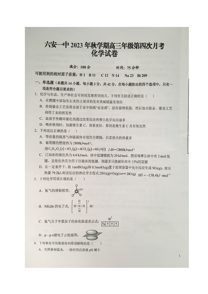 安徽省六安第一中学2023-2024学年高三上学期第四次月考 化学