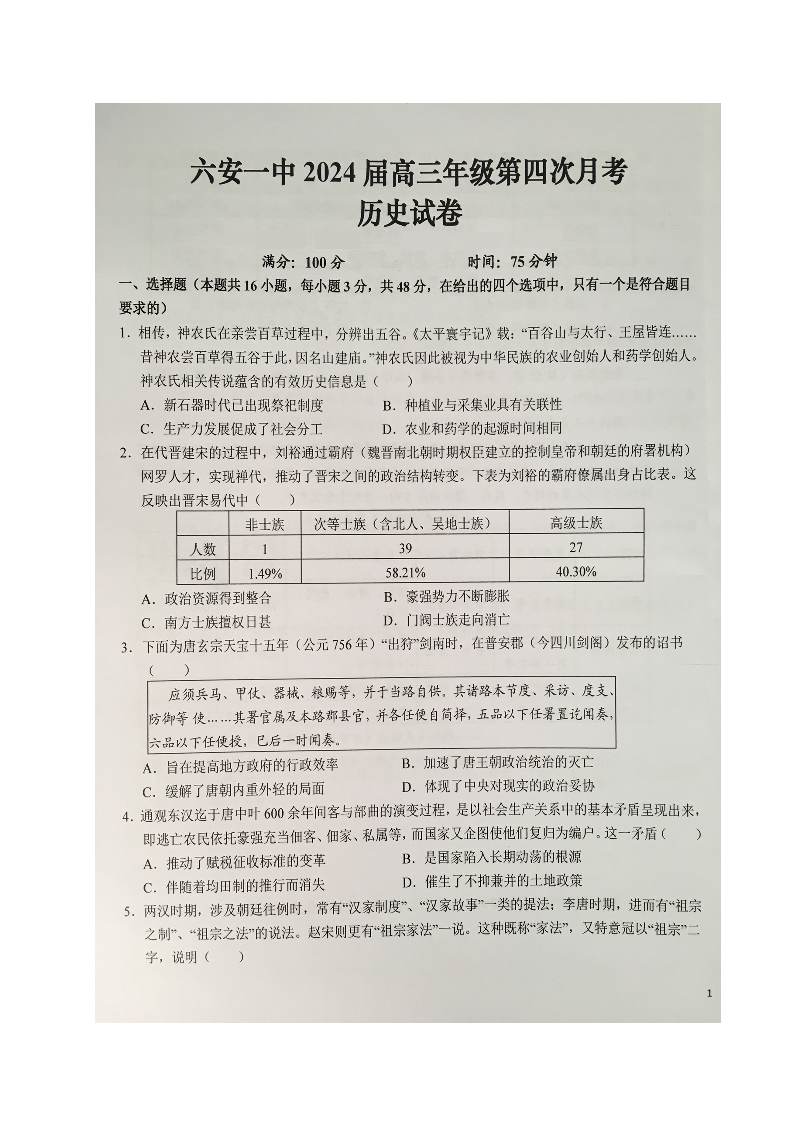 安徽省六安第一中学2023-2024学年高三上学期第四次月考 历史
