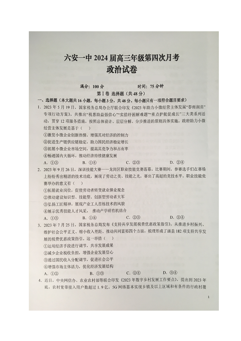 安徽省六安第一中学2023-2024学年高三上学期第四次月考 政治