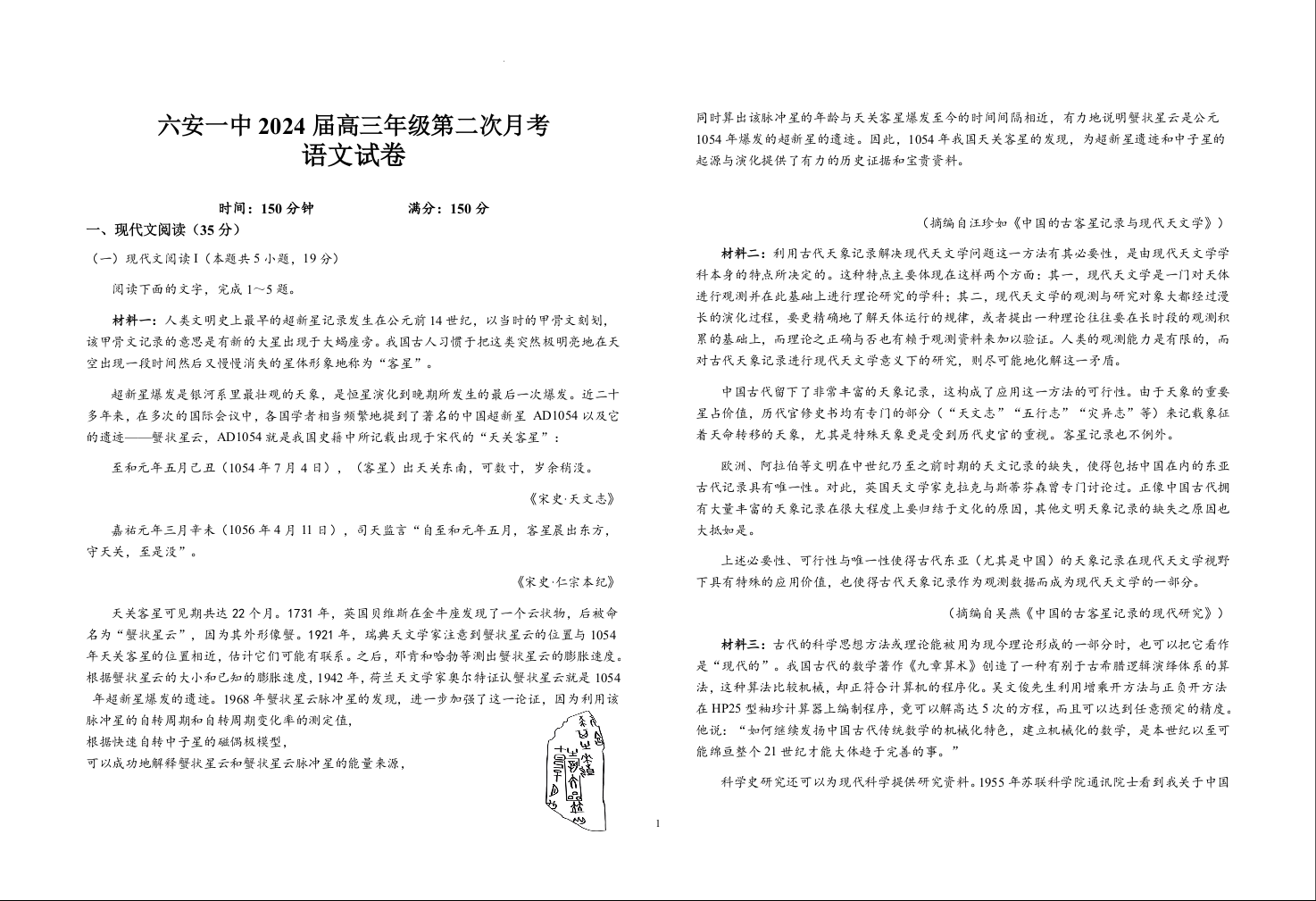 安徽省六安第一中学2023-2024学年高三上学期第二次月考 语文