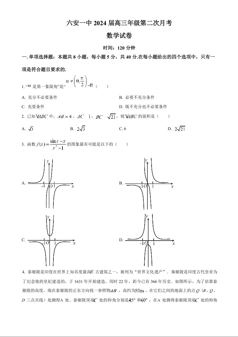 安徽省六安第一中学2023-2024学年高三上学期第二次月考 数学