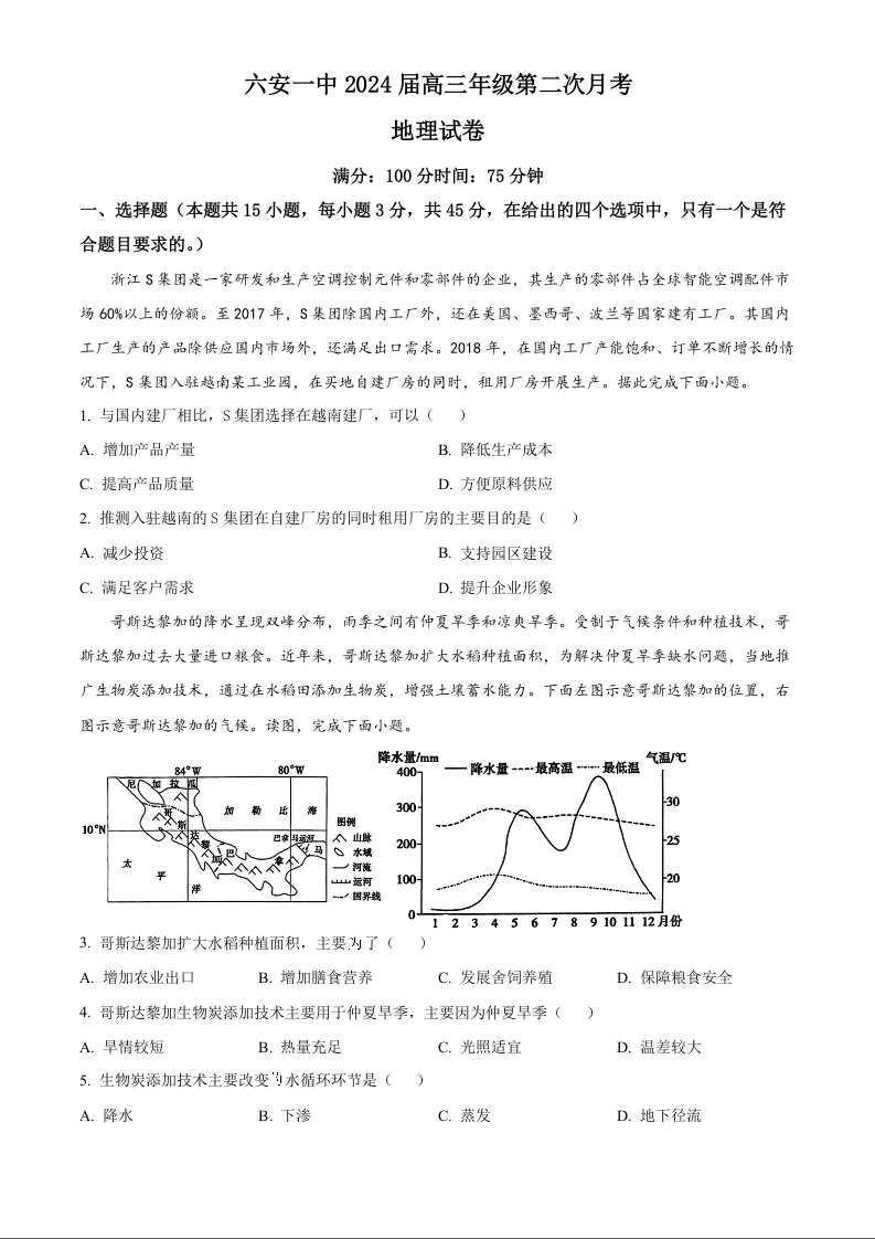 安徽省六安第一中学2023-2024学年高三上学期第二次月考 地理