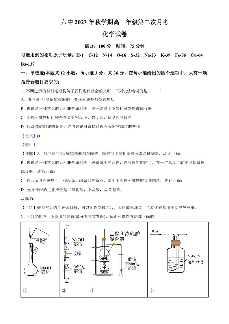 安徽省六安第一中学2023-2024学年高三上学期第二次月考 化学答案