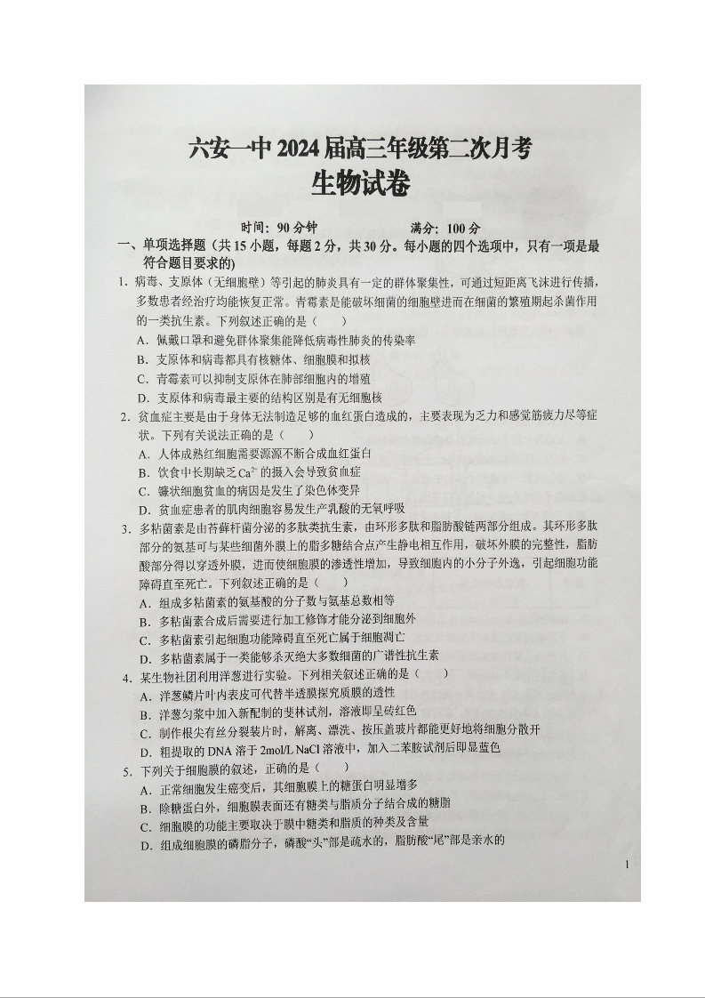 安徽省六安第一中学2023-2024学年高三上学期第二次月考 生物