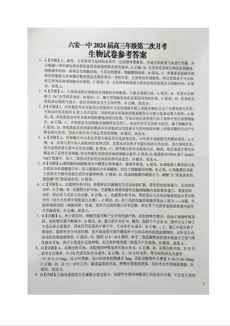 安徽省六安第一中学2023-2024学年高三上学期第二次月考 生物答案