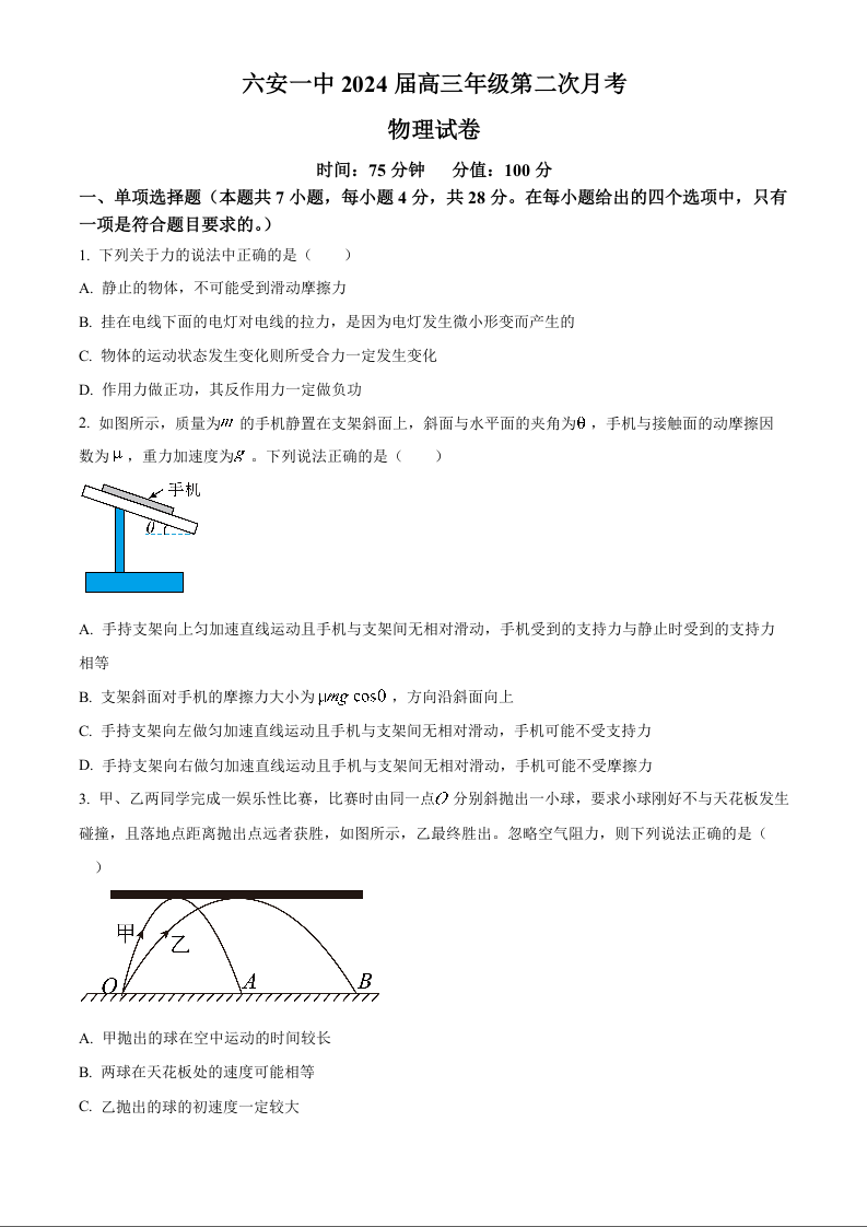 安徽省六安第一中学2023-2024学年高三上学期第二次月考 物理