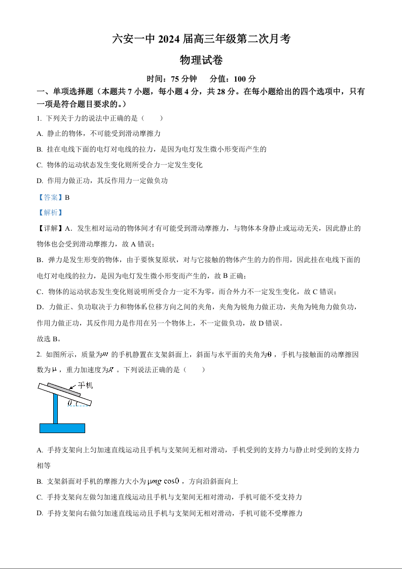 安徽省六安第一中学2023-2024学年高三上学期第二次月考 物理答案