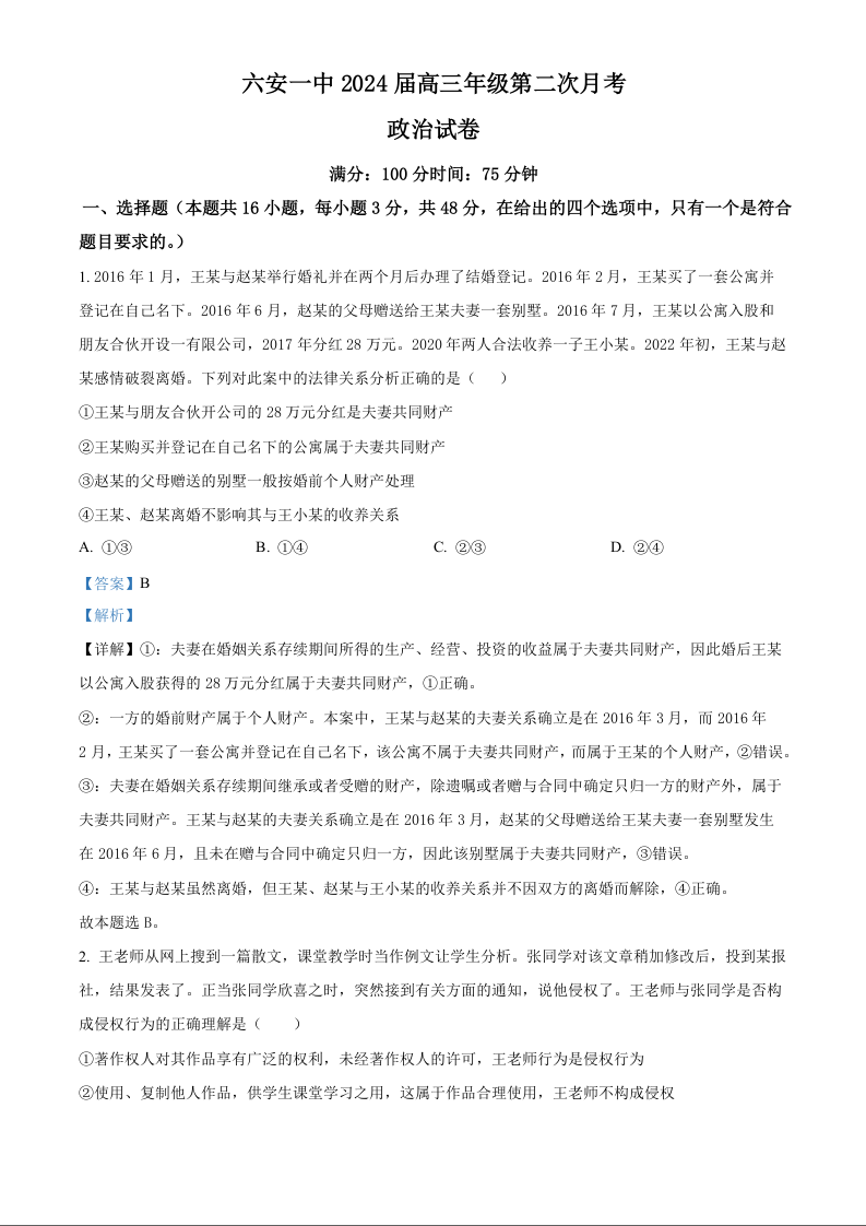 安徽省六安第一中学2023-2024学年高三上学期第二次月考 政治答案