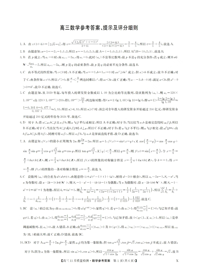 安徽省九师联盟2024届高三11月质量检测 数学答案
