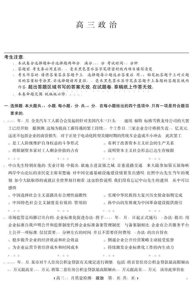 安徽省九师联盟2024届高三11月质量检测 政治