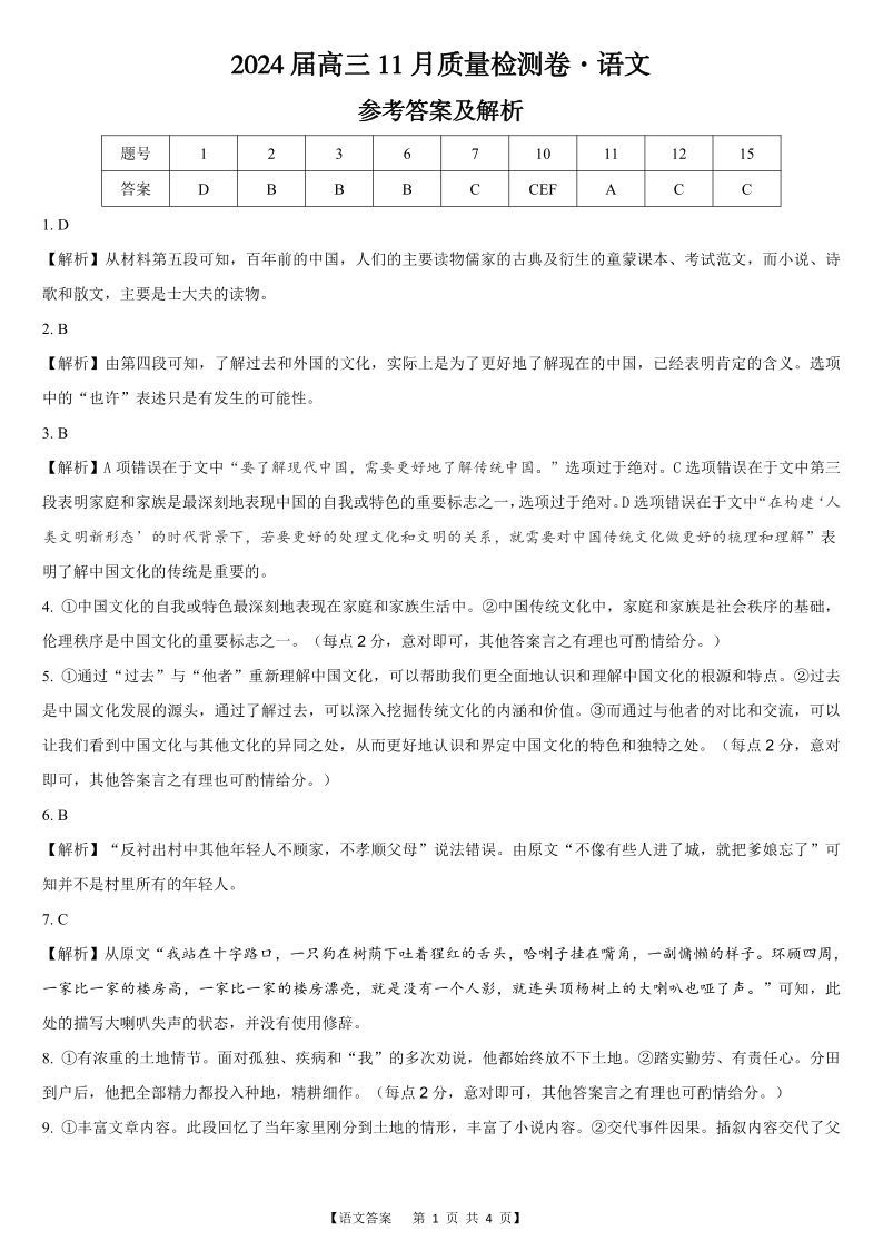 安徽省合肥市第四中学2023-2024学年高三上学期11月月考 语文答案