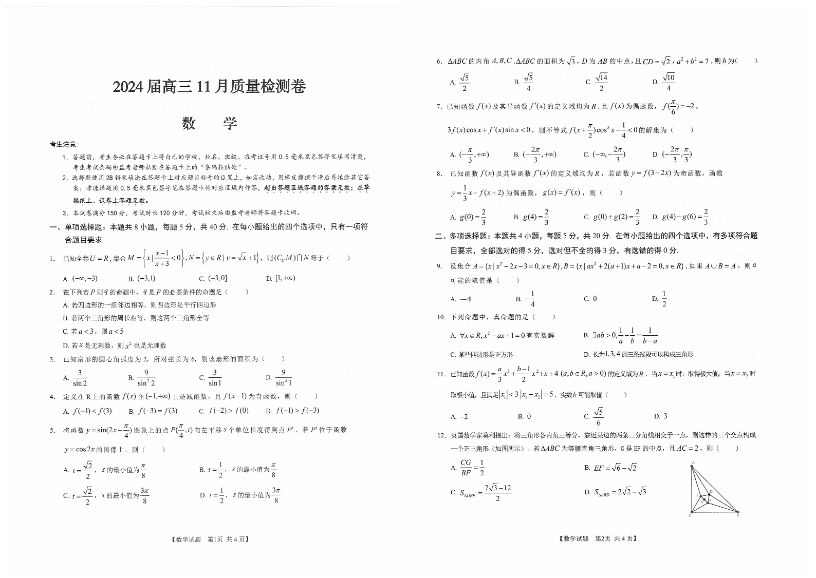 安徽省合肥市第四中学2023-2024学年高三上学期11月月考 数学