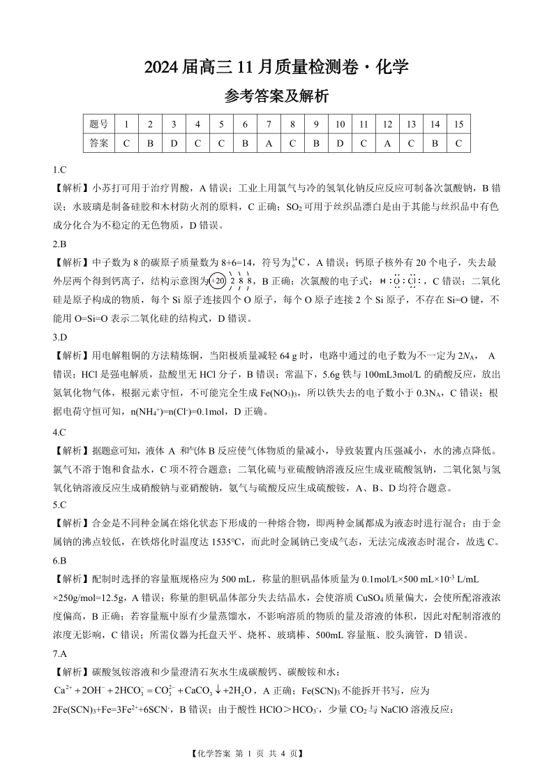 安徽省合肥市第四中学2023-2024学年高三上学期11月月考 化学答案