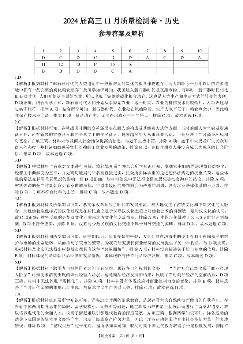 安徽省合肥市第四中学2023-2024学年高三上学期11月月考 历史答案