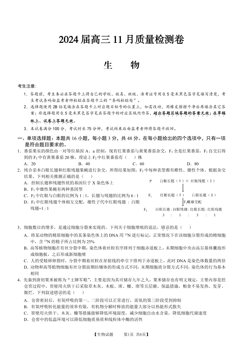 安徽省合肥市第四中学2023-2024学年高三上学期11月月考 生物