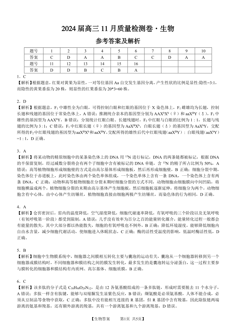 安徽省合肥市第四中学2023-2024学年高三上学期11月月考 生物答案