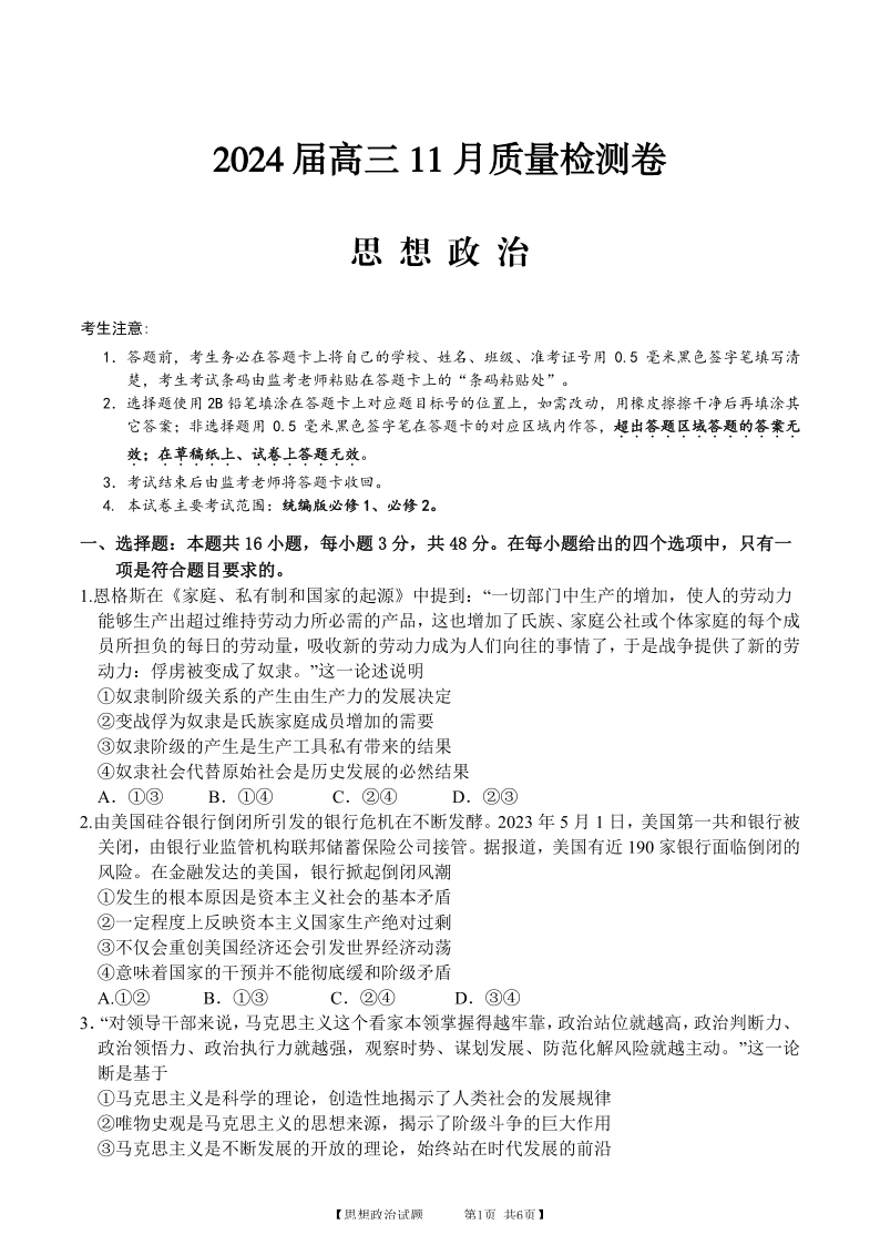 安徽省合肥市第四中学2023-2024学年高三上学期11月月考 政治