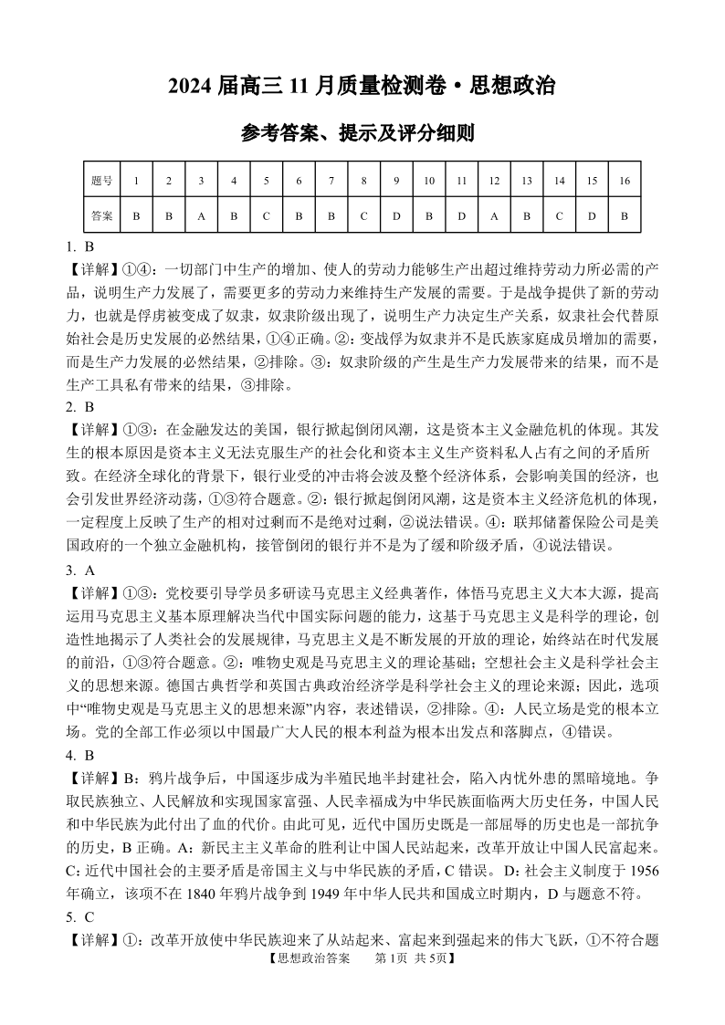安徽省合肥市第四中学2023-2024学年高三上学期11月月考 政治答案