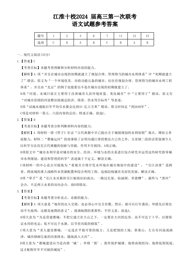 安徽省江淮十校2023-2024学年高三上学期开学考试 语文答案