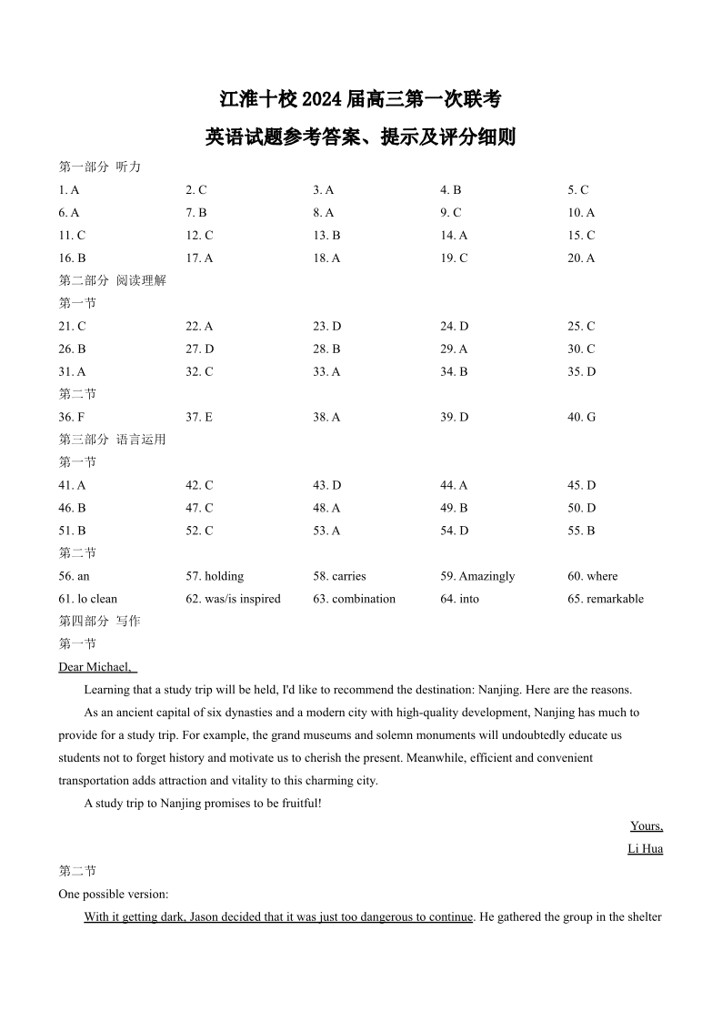 安徽省江淮十校2023-2024学年高三上学期开学考试 英语答案