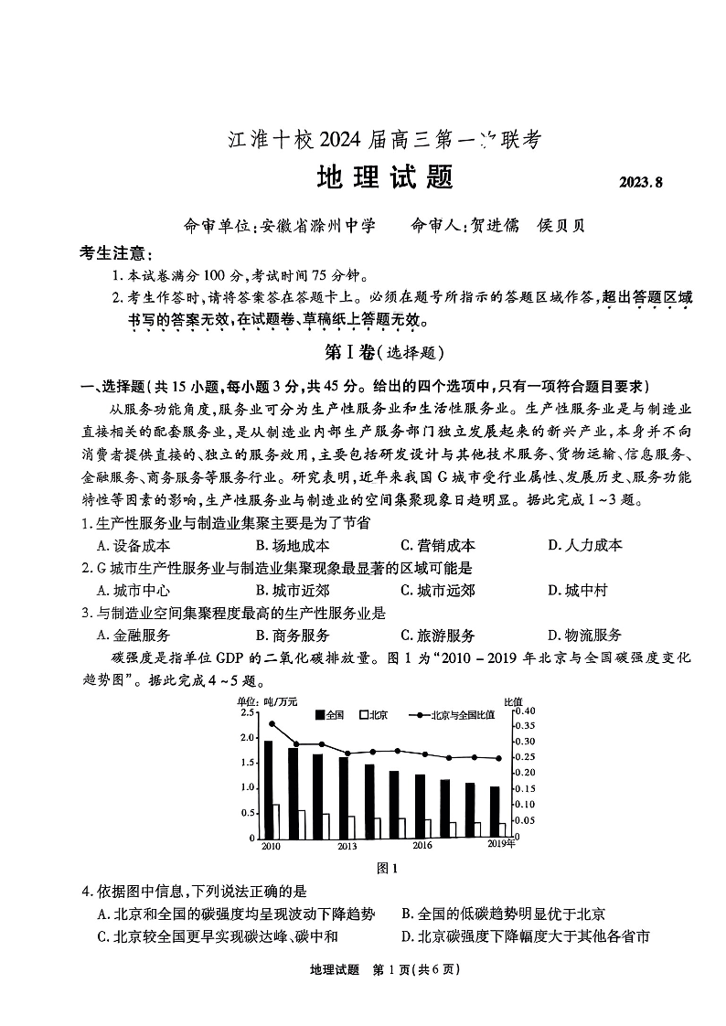 安徽省江淮十校2023-2024学年高三上学期开学考试 地理