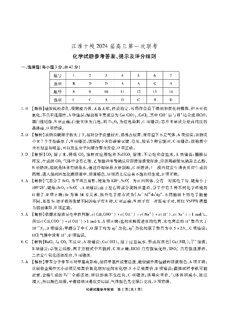 安徽省江淮十校2023-2024学年高三上学期开学考试 化学答案