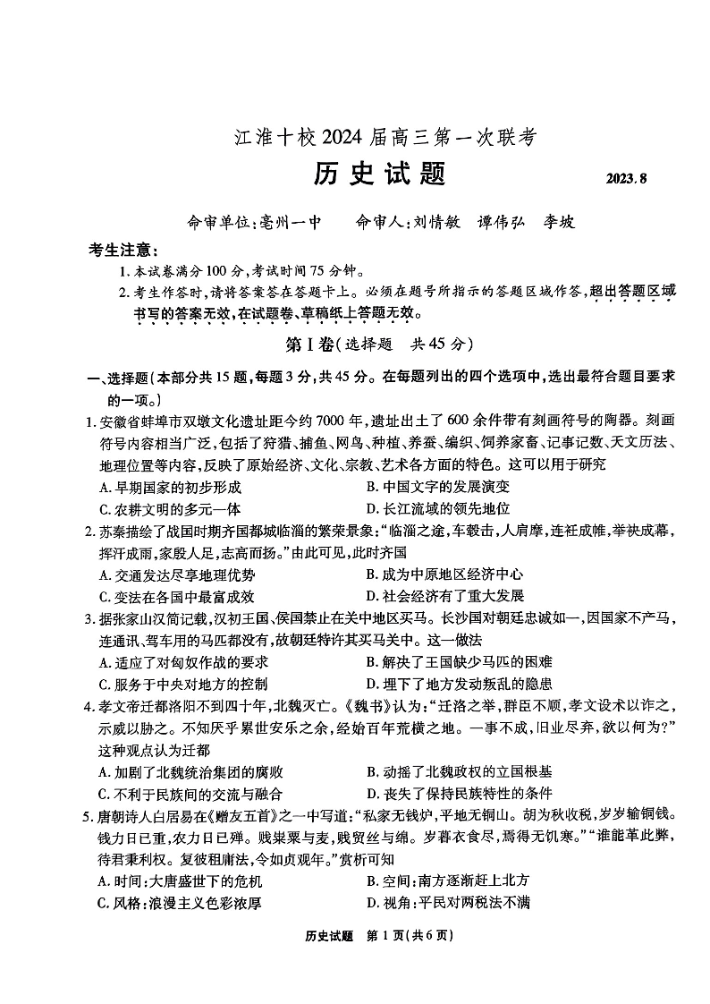安徽省江淮十校2023-2024学年高三上学期开学考试 历史