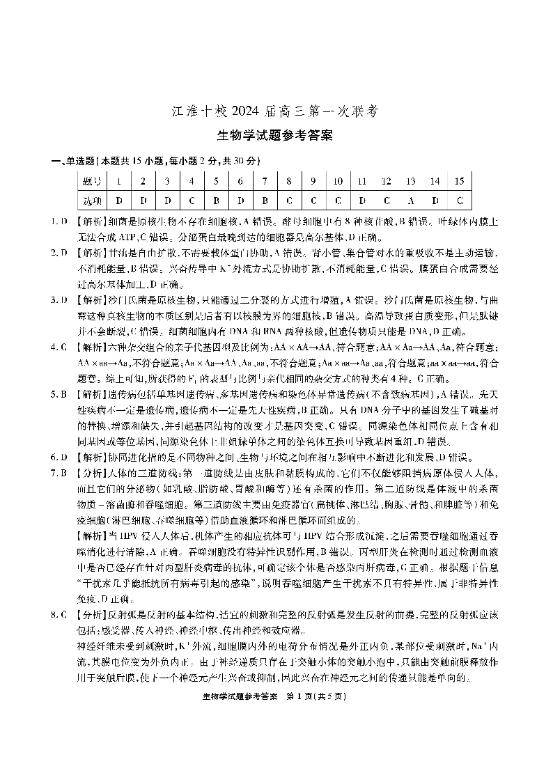 安徽省江淮十校2023-2024学年高三上学期开学考试 生物答案