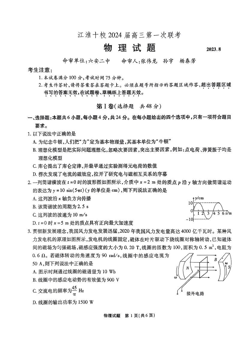 安徽省江淮十校2023-2024学年高三上学期开学考试 物理