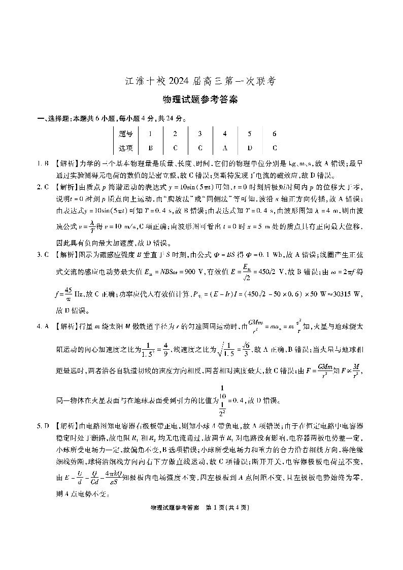 安徽省江淮十校2023-2024学年高三上学期开学考试 物理答案