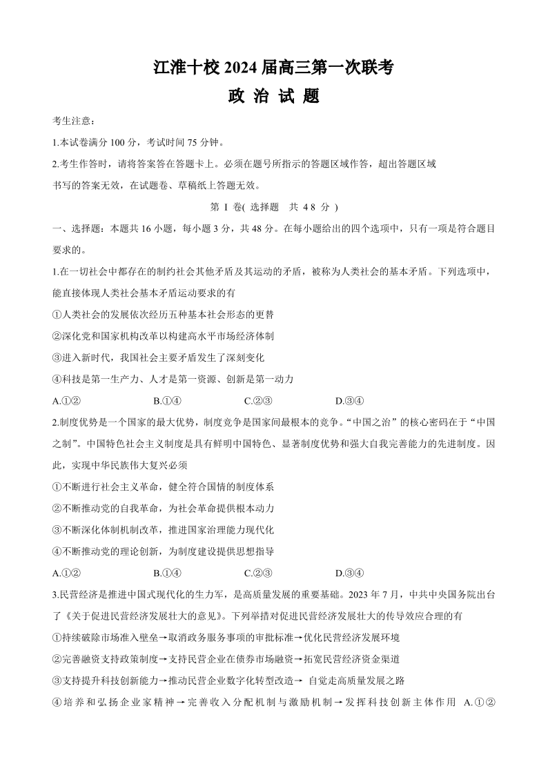 安徽省江淮十校2023-2024学年高三上学期开学考试 政治