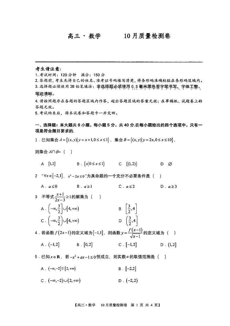 安徽省徽师联盟2023-2024学年高三上学期10月联考 数学