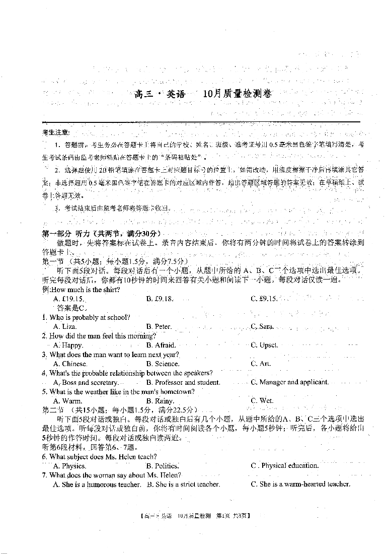 安徽省徽师联盟2023-2024学年高三上学期10月联考 英语