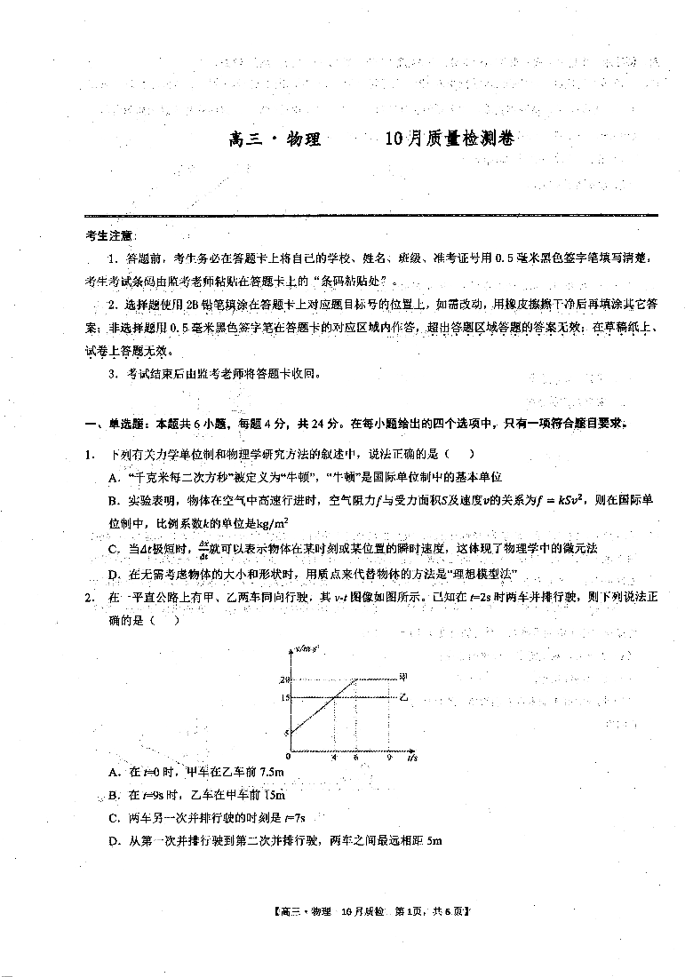 安徽省徽师联盟2023-2024学年高三上学期10月联考 物理