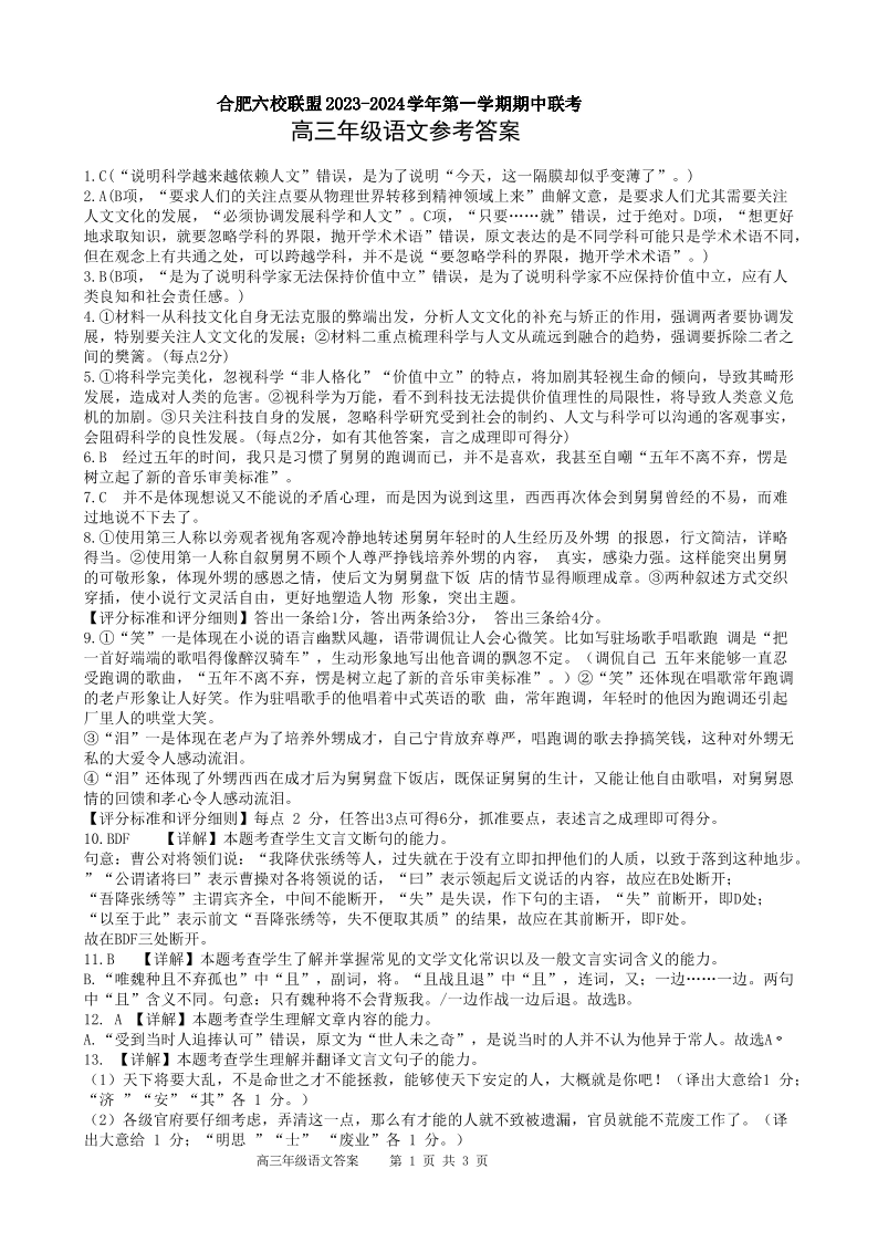 安徽省合肥六校联盟2023-2024学年高三上学期期中联考 语文答案
