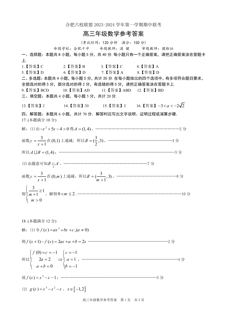 安徽省合肥六校联盟2023-2024学年高三上学期期中联考 数学答案