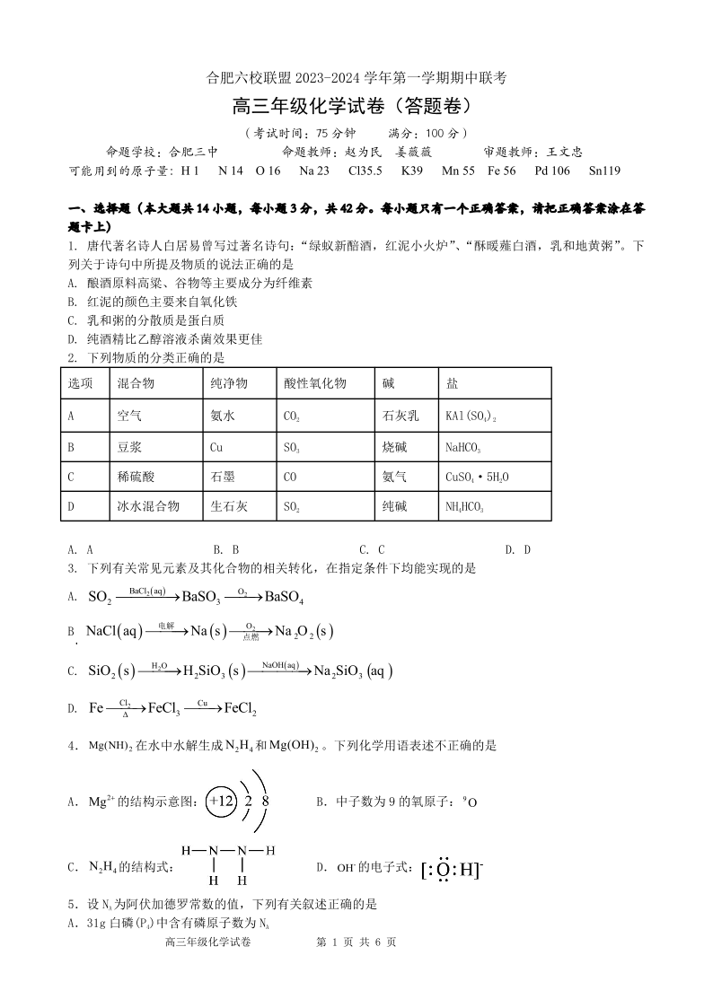 安徽省合肥六校联盟2023-2024学年高三上学期期中联考 化学