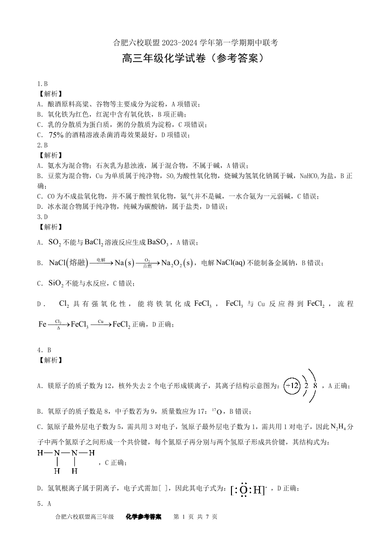 安徽省合肥六校联盟2023-2024学年高三上学期期中联考 化学答案