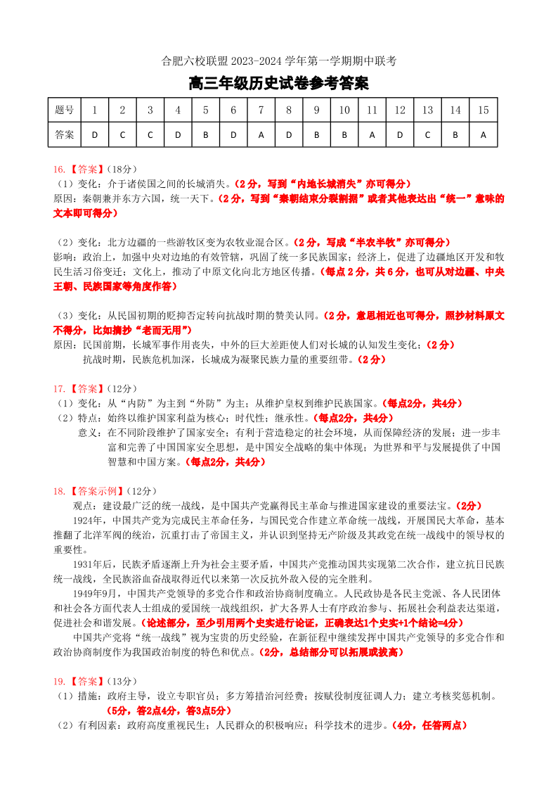 安徽省合肥六校联盟2023-2024学年高三上学期期中联考 历史答案
