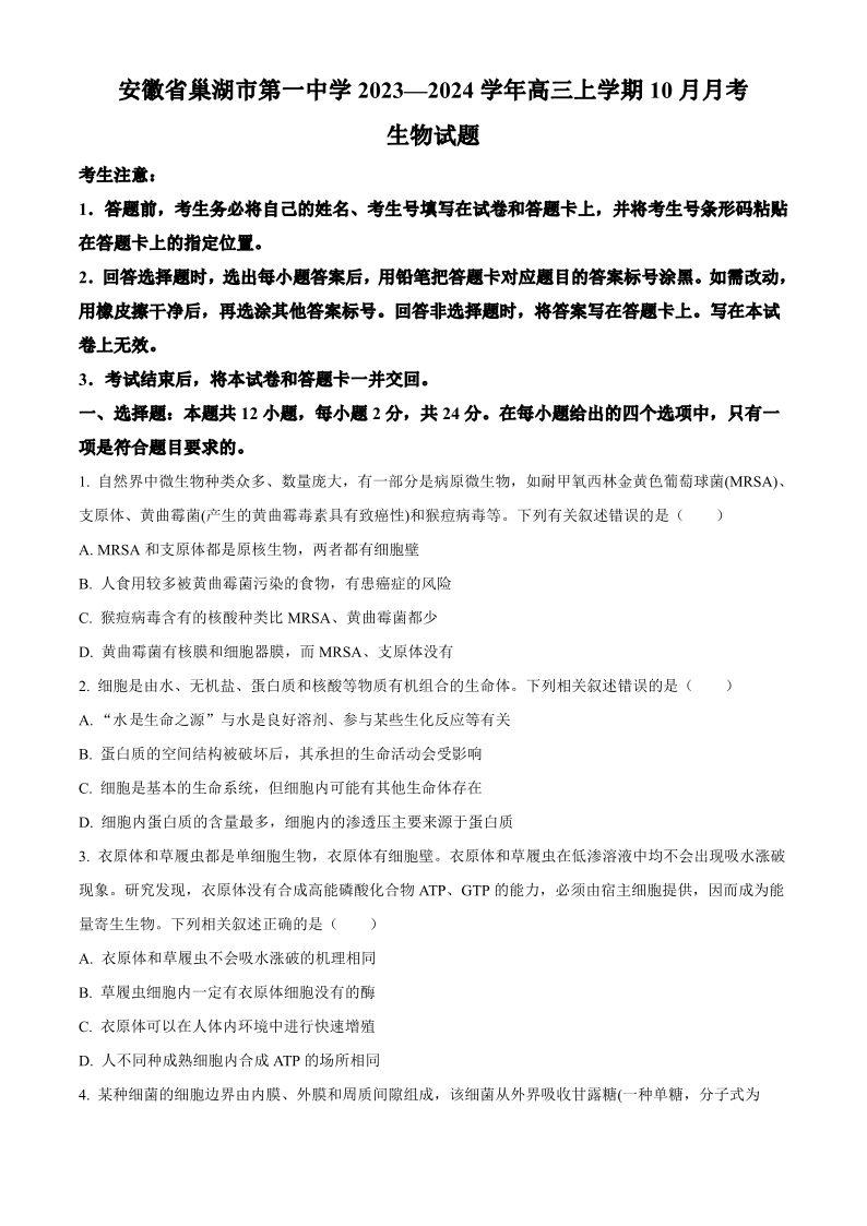 安徽省巢湖市第一中学2024届高三上学期10月月考试题 生物