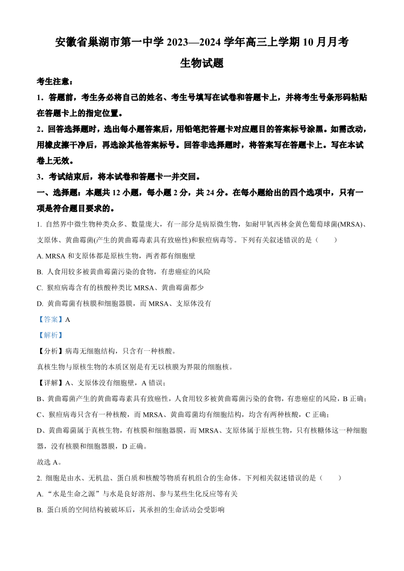 安徽省巢湖市第一中学2024届高三上学期10月月考试题 生物答案