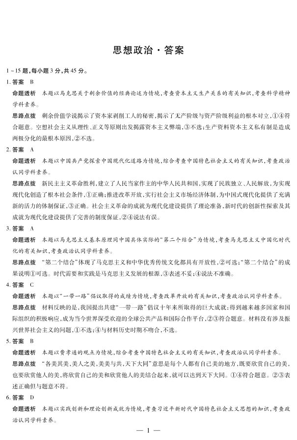 安徽省巢湖市第一中学2024届高三上学期10月月考试题 政治答案