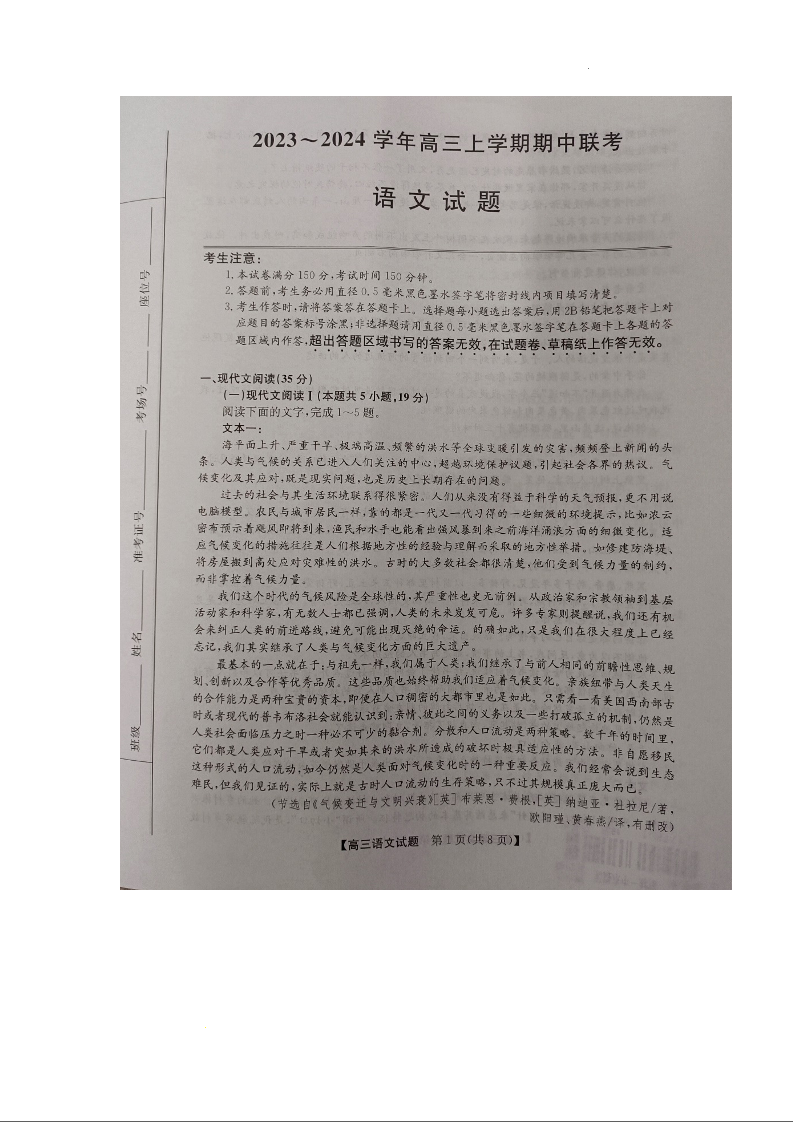 安徽省亳州市蒙城县2023—2024学年高三上学期期中联考 语文