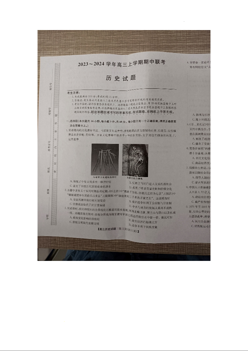 安徽省亳州市蒙城县2023—2024学年高三上学期期中联考 历史